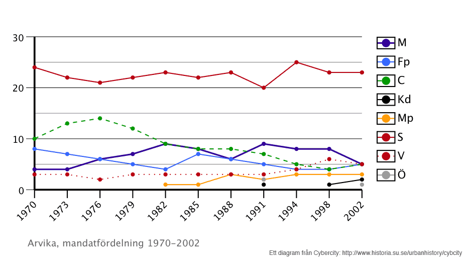 Diagram 3: Antalet mandat i Arvikas stadsfullmäktige