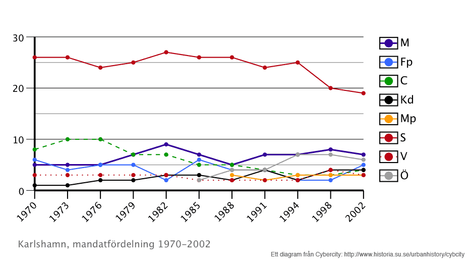 Diagram 3: Antalet mandat i Karlshamns stadsfullmäktige