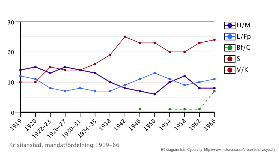 Diagram 3: Antalet mandat i Kristianstads stadsfullmäktige