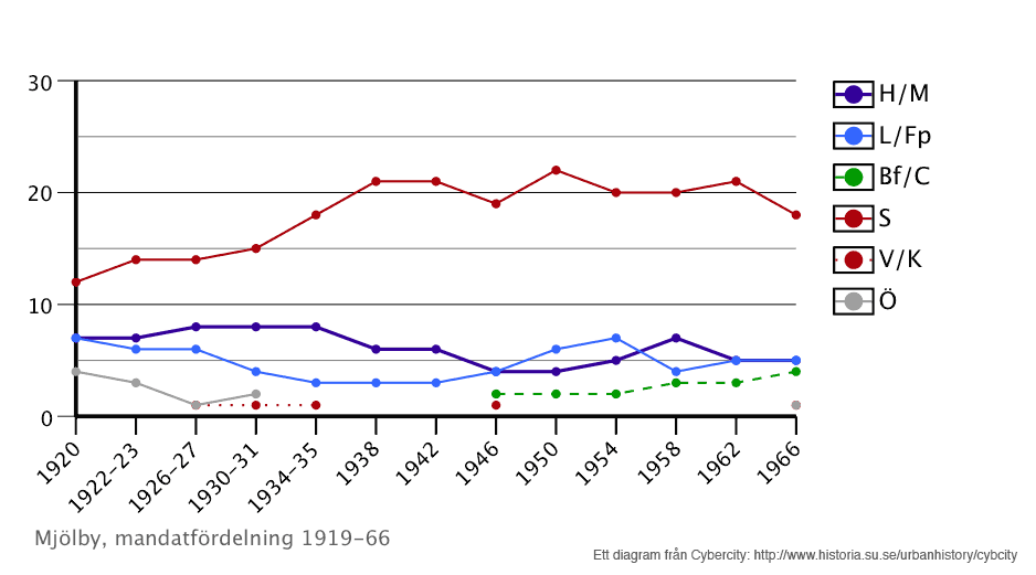Diagram 1: Antalet mandat i Mjölbys stadsfullmäktige