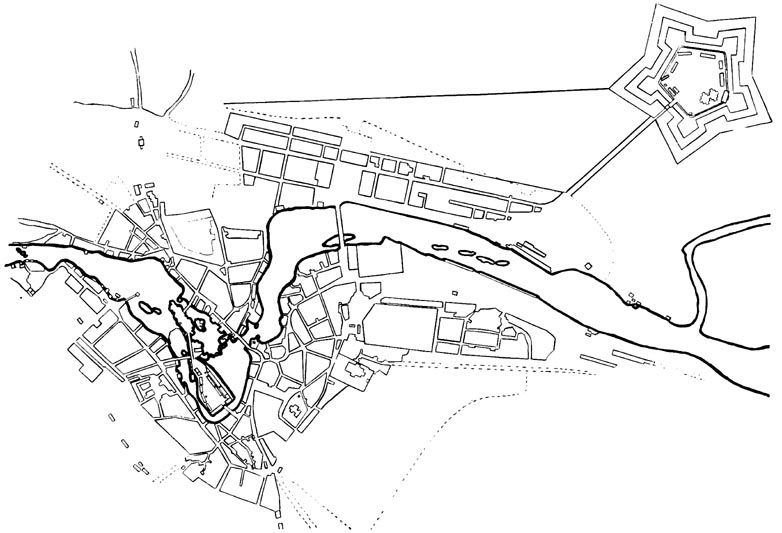 Die Kopie einer Aufmessung des Stadtplans von 1640 zeigt den sich schmal am