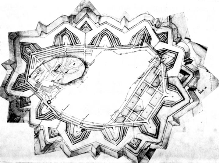 Es war Erik Dahlberg, der 1680 einen Gesamtplan zur Erweiterung und Befestigung Revals vorlegte (Abbildung 2, Norden ist rechts). Darin kartierte er Domberg mit Altstadt und die weitläufigen Vorstädte, die mit kleinen Holzhäusern bebaut waren. In diesen Bestand zeichnete er den zu errichtenden Festungsring mit einer vergleichsweise bescheidenen Stadterweiterung im Osten ein. Etwas deutlicher gehen die Bauplanungen aus einem Entwurf von 1685 hervor (Abbildung 3), der den Bestand vernachlässigt und die neuen Anlagen hervorhebt. Die Flächen für die Stadterweiterung im Osten waren durch Schleifung älterer, unmodern gewordener Festungswerke zu gewinnen. Der neue Stadtteil erhielt einen zentralen Marktplatz und - so weit möglich - rechteckige Baublöcke. Gegenüber wurde unterhalb des Domberges ein kleines zusätzliches Stadtgebiet unmittelbar vor dem neuen Wall erschlossen. Der Festungsring stand mit elf Bastionen, breiten Gäben und sechs Ravelins auf der Höhe der Festungstechnik. Die Bauarbeiten begannen 1684 und waren 1687 noch nicht abgeschlossen. Weite Teile der Altstadt sind bis heute von den damals errichteten Anlagen geprägt.