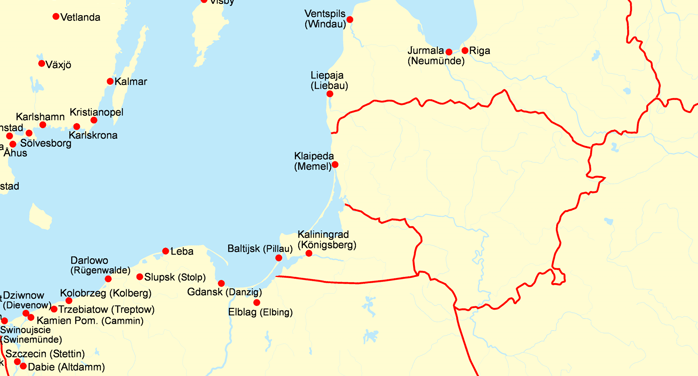 Riga Gdańsk (Danzig) Kaliningrad Baltijsk (Pillau) Elblag (Elbing) Jurmala (Neumünde) Kolobrzeg (Kolberg) Szczecin (Stettin) Dabie (Altdamm) Liepaja (Liebau) Vetlanda Darlowo (Rügenwalde) Trzebiatow (Treptow) Slupsk (Stolp) Sölvesborg Kristianopel Klaipeda (Memel) Kamien Pomorskie (Cammin) Swinoujscie (Swinemünde) Ventspils (Windau) Karlshamn Åhus Leba (Leba) Växjö Dziwnow (Dievenow) Karlskrona Kalmar