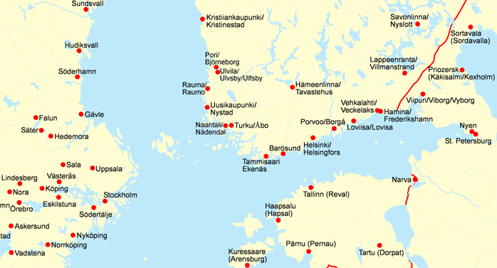 Naantali / Nådendal Ulvila / Ulvsby / Ulfsby Rauma / Raumo Tartu (Dorpat) Kuressaare (Arensburg) Nyköping Norrköping Vadstena Pärnu (Pernau) Eskilstuna Köping Nora Örebro Askersund Kristiiankaupunki / Kristinestad Västerås Stockholm Södertälje Lindesberg Tallinn (Reval) Narva St. Petersburg Nyen Vyborg (Viipuri) Loviisa / Lovisa Haapsalu (Hapsal) Uusikaupunki / Nystad Turku / Åbo Tammisaari / Ekenäs Barösund Helsinki / Helsingfors Porvoo / Borgå Hämeenlinna / Tavastehus Savonlinna / Nyslott Lappeenranta / Villmanstrand Sortavala (Sordavalla) Priozersk (Käkisalmi / Kexholm) Hudiksvall Söderhamn Gävle Falun Säter Hedemora Uppsala Sala Pori / Björneborg Sundsvall Hamina / Frederikshamn